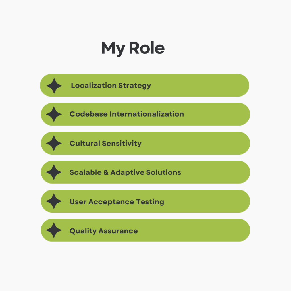 My role involved coordinating with diverse teams and translators to prioritize features and requirements for the software’s internationalization, ensuring support for multiple languages and regional nuances, including character sets and date formats.